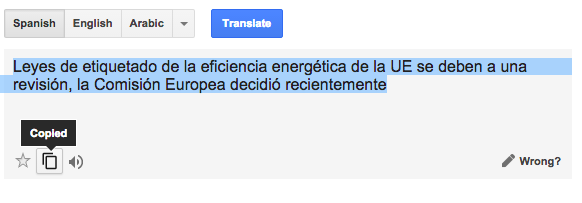 Google Translate added a few years ago a "select all" button that automatically selected the translation, so you could easily copy the text and paste it in an email message, a document or somewhere else. In Chrome, the "select all" has been replaced with a new "copy" button that selects the entire translation and copies the text to the clipboard. The nice thing is that this feature uses HTML5, not Flash. Unfortunately, the new feature is only available in Chrome and all the other browsers still get the old "select all" button.